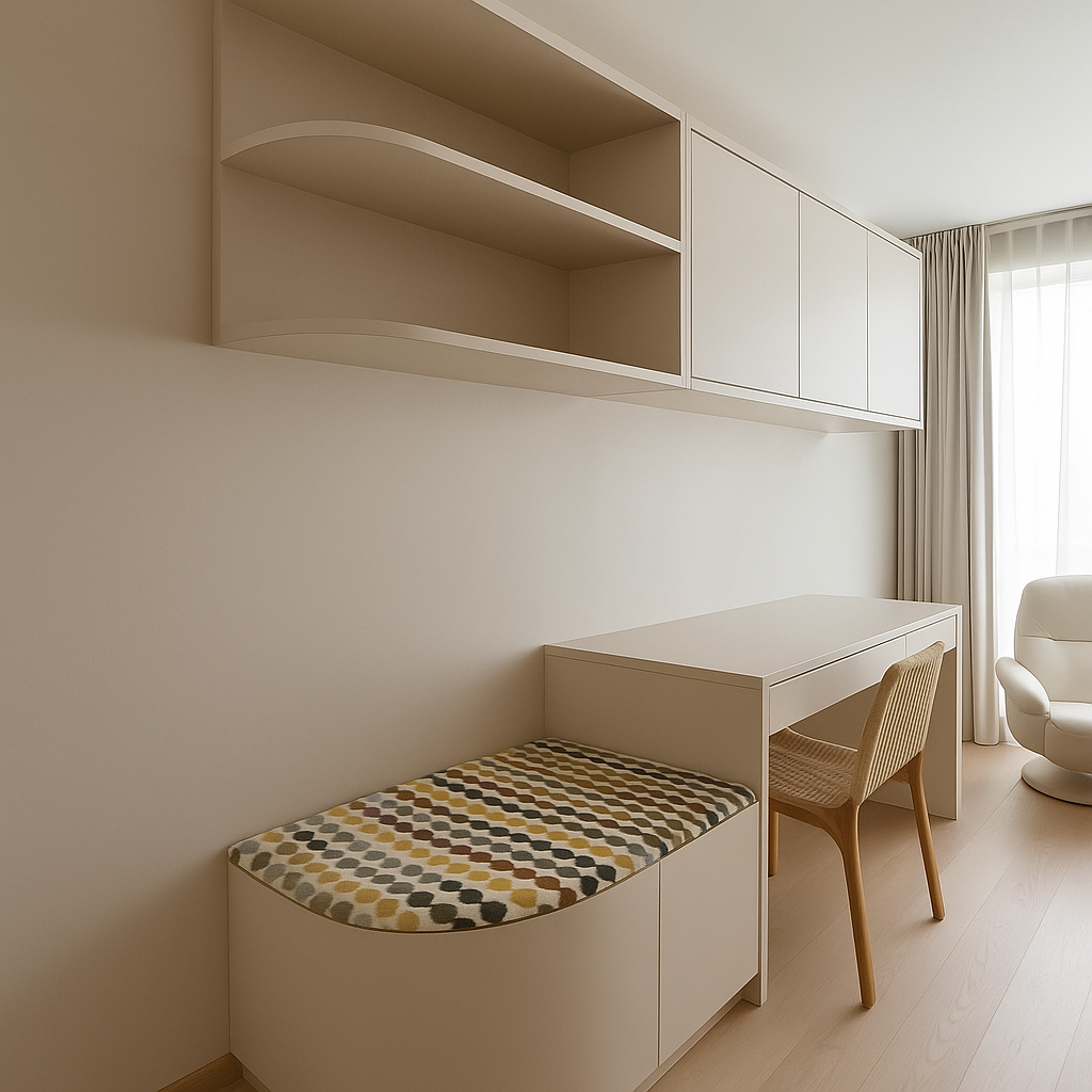 Cette chambre d’enfant, destinée à une petite fille, a été repensée pour offrir une ambiance douce, colorée et adaptée à son quotidien. En conservant le lit existant ainsi que les nouveaux rideaux, l’objectif était de créer un univers harmonieux qui s’accorde parfaitement avec ces éléments tout en apportant une vraie fraîcheur. De nombreux rangements sur mesure ont été imaginés pour optimiser chaque recoin et rendre l’espace à la fois fonctionnel et ergonomique. Un grand bureau a également été intégré, offrant une zone de travail confortable et évolutive. Les choix de couleurs et de détails décoratifs ont été pensés pour convenir à une jeune enfant tout en permettant à la chambre d’évoluer aisément vers un univers d’adolescente.