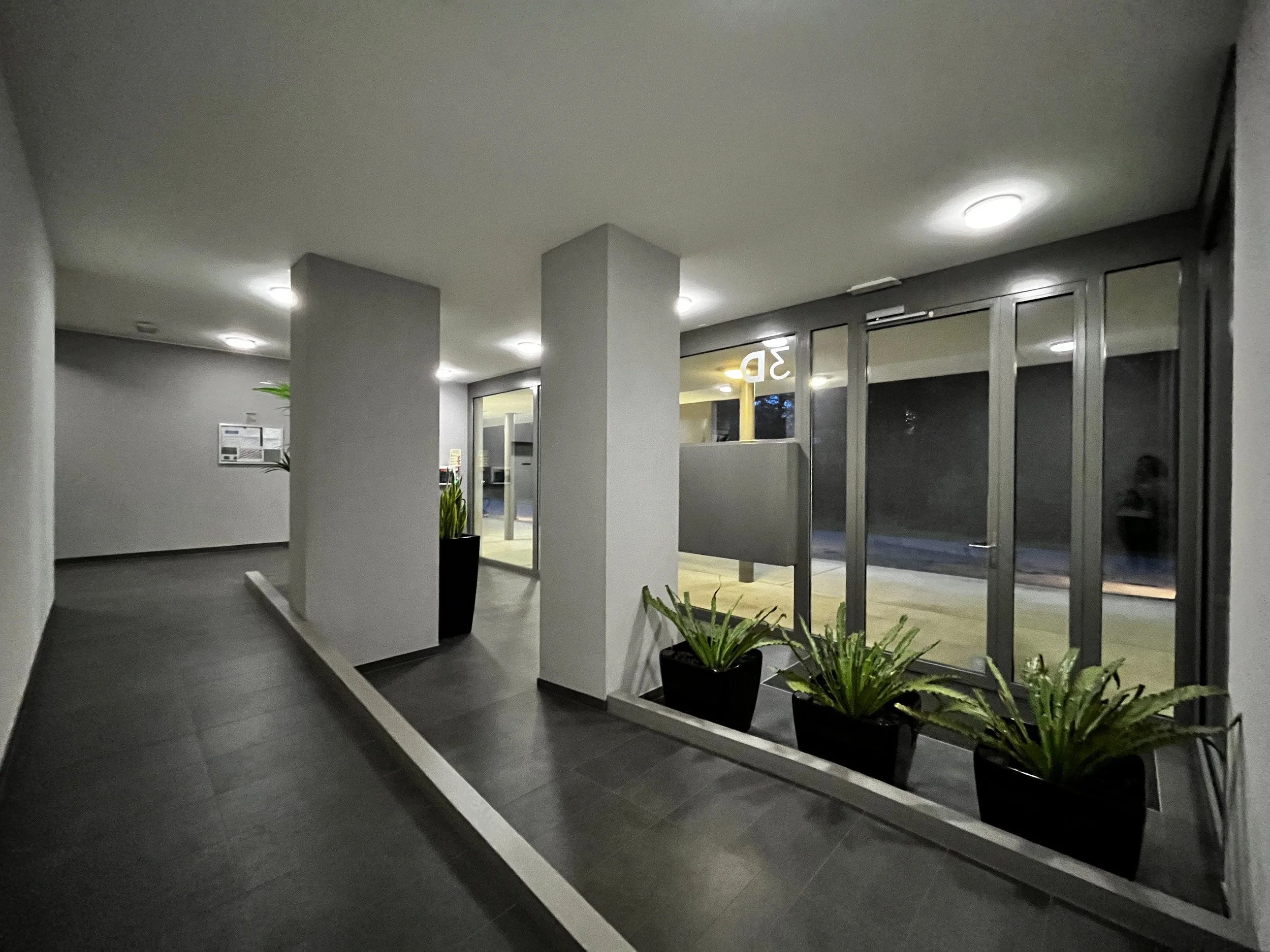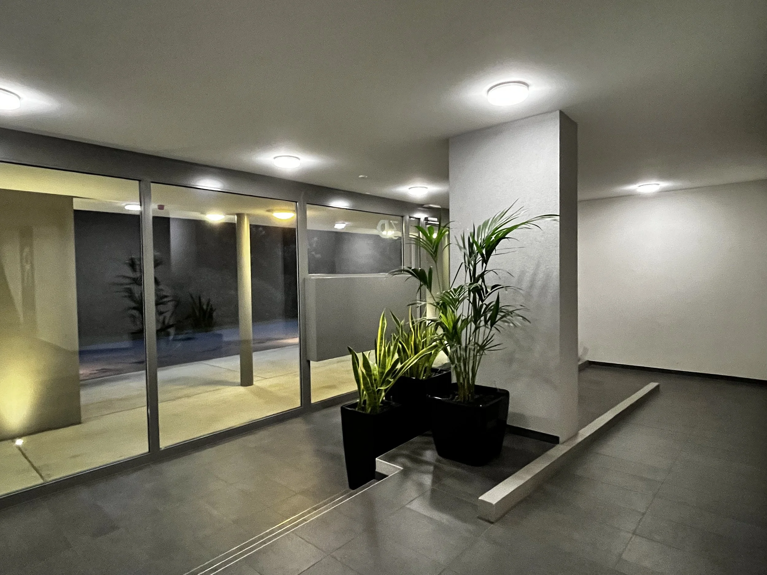 Apporter une touche d’élégance dès l’entrée de l’immeuble en optimisant le système d’éclairage. Les murs du hall d’entrée ont été habillés de tasseaux de bois. Au niveau du palier, le crépis est poncé pour le rendre visuellement plus lisse; puis recouvert d’une peinture demi-satin afin d’obtenir un aspect plus doux au toucher. L’ensemble des revêtements muraux, dans les teintes grises, réchauffent ce grand espace tout en s’harmonisant avec le carrelage existant. L’ensemble des 4 étages et de la cage d’escaliers a été rénové dans le même esprit par la suite.